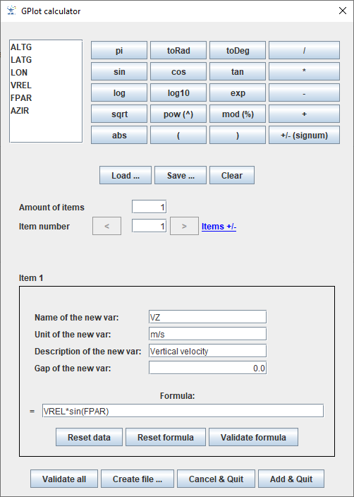 If we push on that button a new window will appear where it will be possible to define specific equation(s) to get additional variables. In the example below, we have define the "VZ" variable for the vertical velocity, defined by [math]\displaystyle{ V_z = V_{rel}*sin(\gamma_{rel}) }[/math] with [math]\displaystyle{ V_{rel} = VREL }[/math] and [math]\displaystyle{ \gamma_{rel} = FPAR }[/math].