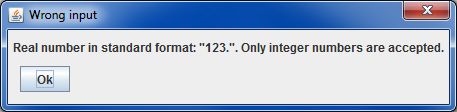 In the previous versions, when a user tried to enter something different as a digit in an integer field, no message appeared. For example, entering 123x45 would be the same as 12345. Problems may occured when a user would enter a real value in an integer field (as may be, he did not know it was an integer field) : for example 123.45 will give 12345 without any message. Now, only in case of "." or "e" input, a message will be sent to the user.