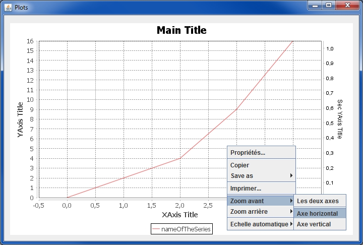 As we use JFreeChart, it is then possible to use all the functionnalities proposed by this product, specially by using the context menu obtained by clicking ont the right button of the mouse.